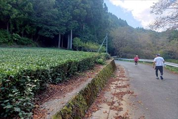 高塚山の中腹だろうか「半明」「大久保」と比較的わかりやすい道を歩く。山の中に奇麗な茶畑が出た来た。八満神社で小休憩。