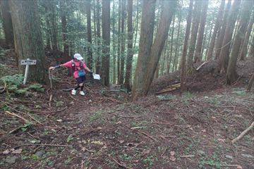友さんの判断で、その雑草の中を進んだ。すると尾根沿を歩く境杭に挟まれた道が現れた。その坂を上ると朽ち果てた手すりが出てきて左上に林道が現れた。遊歩道終わり林道に出たところにも秋葉街道・塩の道の道標があった。ここからは林道歩き、まだまだ森町三倉とあった。