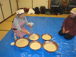 会場では地元ソバ打ち名人での指導の元、ソバ打ちや。
