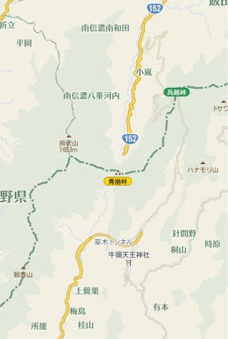 地図で見るとわかるが国道152号線は青崩峠で途絶えている。兵越峠はかなり遠回りになる。
