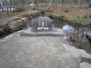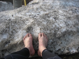 暑い熱い、まだ道路横に残っている雪で、その足を冷やした。