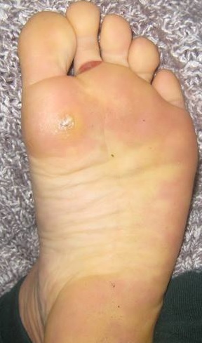 左足の、親指と人差し指の間、、、人差し指の根本、、、このところに水ぶくれができている。