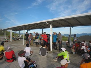 スタート30分前、好例の唱歌「富士山」を参加者とスタッフみんなで歌う。