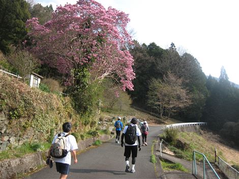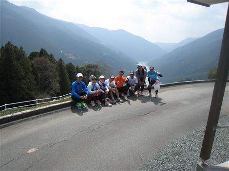 龍山のお風呂「やすらぎの湯」の駐車場の荘川桜も満開、私たちランナーはスタート前に集合写真を一枚撮った。