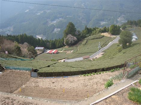 お茶が綺麗に剪定してあり、川向うには午前中に走った道が見える。
