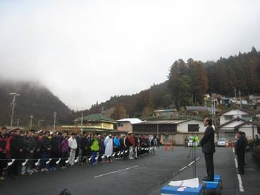 「ただいまから、第41回天竜区佐久間駅伝大会の開会式を始めます。参加チームの皆さん、並び大会関係者は駐車場へお集まりください」