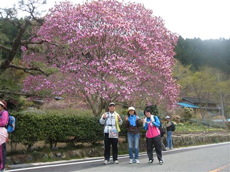 羽ヶ庄の〇澤さん家のモクレンの花をバックにパチリ。