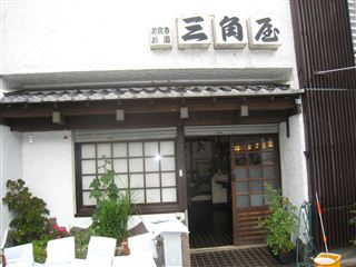 ダムの下の町、小腹がすいたので「三角屋」の玄関に入ると、まだ準備中とのこと。
