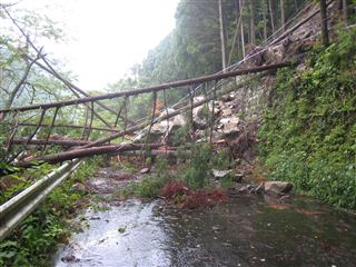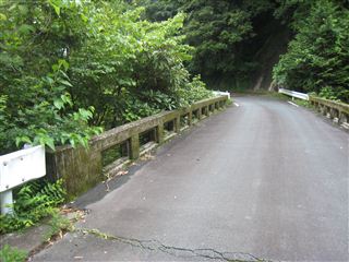 少し走り、瀬尻の橋あたりに、通行止めのバリケードがあり、「崩落工事中」だそうだ。
