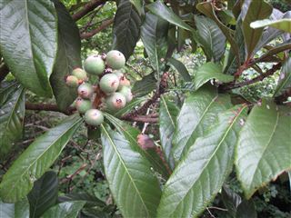 大輪から、車が少ない天竜川の東岸を行き、瀬尻の橋の手前沢の橋あたりにビワの木発見!!