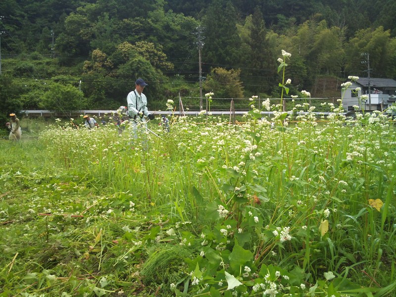 朝8時から、NPOがんばらまいか佐久間が行っている、ソバ畑の草刈の作業があった。