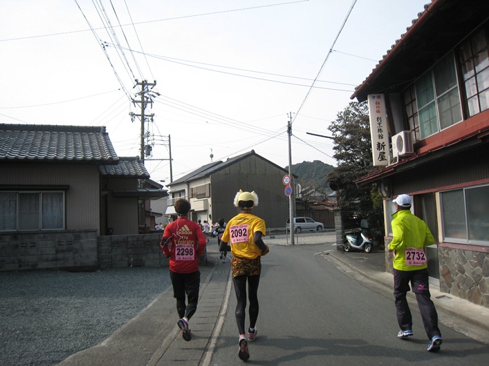 レース後半、沿道で子供が「牛は走ってくる!!」と言っていたのが聞こえ『これは牛ではない鬼のつもりの仮装だよ』と思って走っていると・・・・・すぐ横を身体全体の牛のぬいぐるみを着たランナーに追い抜かれてしまった。