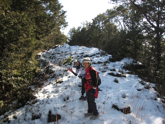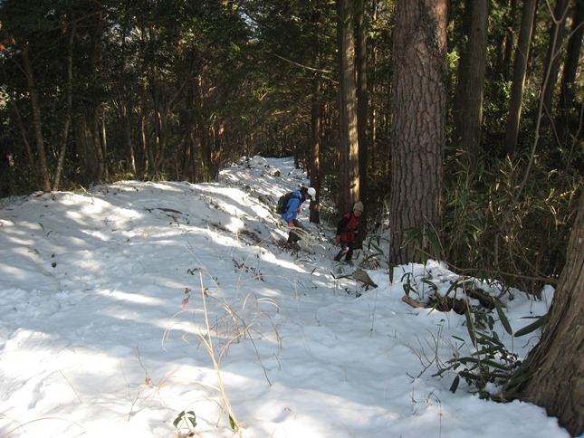 しかし、その北尾根に向かう坂道が雪だらけ、滑る滑る。