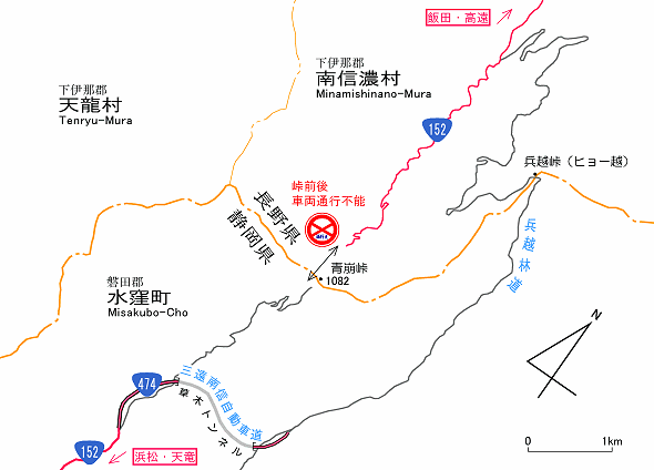 国道152号線は浜松から信州に向うが、地図で見ると、ここ青くずれ峠で切れている。