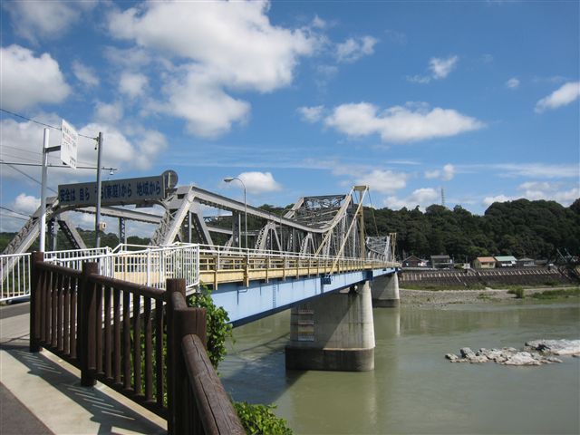 飯田線の鉄橋手前を左に折れ、今は廃校になった佐久間中学校跡前を走り踏切を越え、線路沿いを走ると、天竜川橋りょうの横に着いている歩道を走る。
