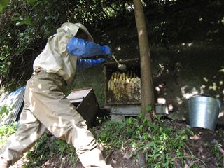 私は、ミツバチの密の収穫体験のお手伝いだ。
