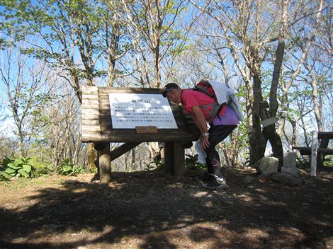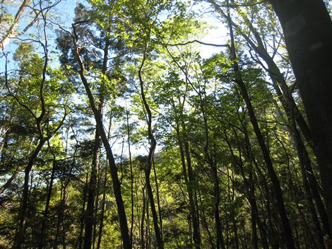 山頂に近くなると、杉山が、広葉樹になり新緑がの間から青空が見えてくる。